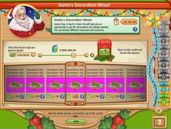 วงล้อเสี่ยงโชครับคริสต์มาส สามารถเล่นได้ไม่ยาก ใช้เพียงเงินในเกม ไม่ต้องใช้เติมเงินจ่ายด้วยเงินจริง ของรางวัลมากมาย มีทั้งได้เงินเพิ่ม และบรรดาสิ่งก่อสร้างจากเทศกาลเก่าๆ ที่หาซื้อไม่ได้แล้ว หมดเขต 1 มกราคม 2021 นี้