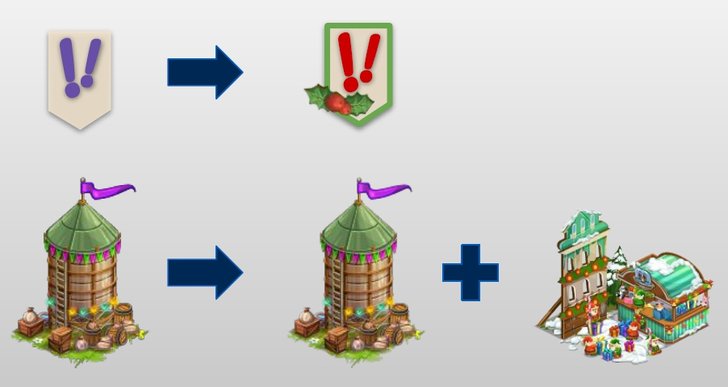 สิ่งก่อสร้างต่างๆในฟาร์มปกติ สามารถอัปเกรดเปลี่ยนไปเป็นสกินรับเทศกาลได้ พบกับเล้าไก่ คอกหมู คอกวัว ในแบบประดับตกแต่งเทศกาลนี้โดยเฉพาะ